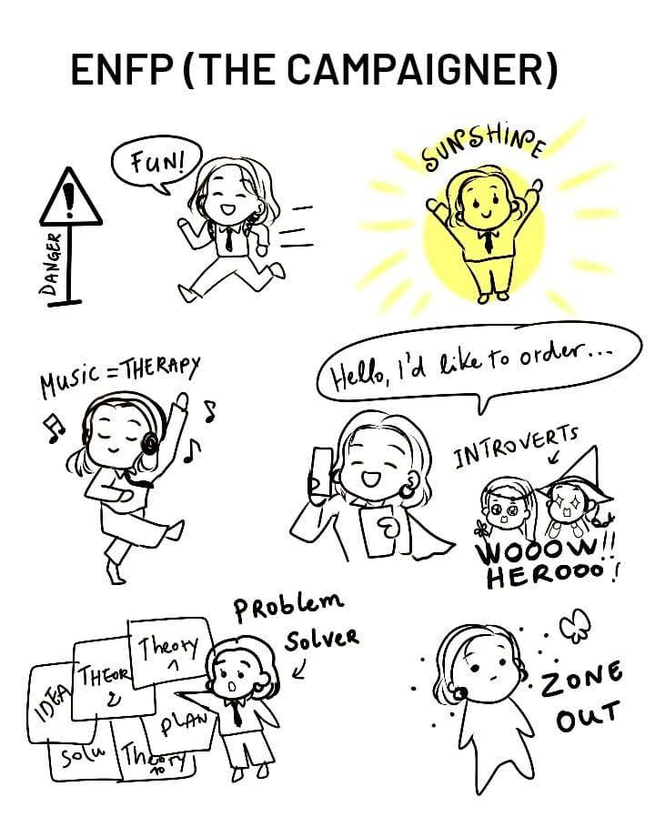 ENFP는 외향적인 성격이고 사람들을 나름의 방식으로 즐겁고 기쁘게 생성시켜 줘요. 적당히 충동적인 몽상가적 기질도 있어요. 그렇기 때문에 본인이 하고 싶은 일이 있으면 무작정 뛰어들어 뭐든 여러 개라도 벌려 놓는 보는 스타일이라고 합니다. NP형 특유의 사회적인 틀과 통념에 박히는 것을 지루해해요.